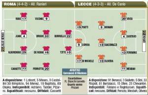FANTACALCIO SERIE A ROMA LECCE FORMAZIONI – Oggi alle ore 18,00 si giocherà la seconda partita di Serie A dopo l’anticipo del venerdì sera giocato ieri dall’Inter che è andata a vincere in casa del Genoa. Quest’oggi alle 18,00 la Roma ospita allo stadio Olimpico i pugliesi del Lecce, i giallorossi cercheranno una vittoria molto importante per la classifica e per il morale. Ecco le probabili formazioni della partita prese dal Corriere dello Sport.