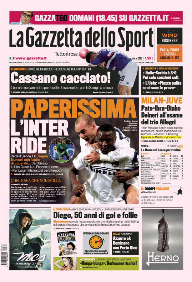 RASSEGNA GAZZETTA – La Gazzetta dello Sport parla della vittoria dell’Inter sul campo del Genoa con il gol di Muntari coadiuvato involontariamente dalla papera del portiere del Grifone Eduardo. Tre punti importanti per la formazione allenata da Benitez.