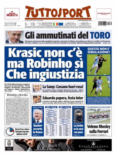TUTTOSPORT RASSEGNA – Il quotidiano torinese Tuttosport parla invece della squalifica di due giornate inflitta a Milos Krasic. Ieri il giocatore si aspettava un ribaltamento della sentenza ma la squalifica è stata confermata. Niente squalifica per Robinho che durante Napoli-Milan ha accentuato la manata di Aronica.