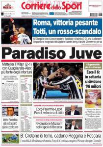 RASSEGNA STAMPA CORRIERE DELLO SPORT ITALIA – La Juve è in paradiso, come riporta la prima pagina del Corriere dello Sport infatti i bianconeri dopo aver realizzato la strepitosa vittoria in casa del Milan sono al settimo cielo. Quagliarella-Del Piero, non basta Ibrahimovic per i rossoneri ed il gioco è fatto! Tre punti importanti per credere ancora alla rincorsa scudetto, brusco stop del Milan invece che perde le sua prima partita stagionale casalinga.