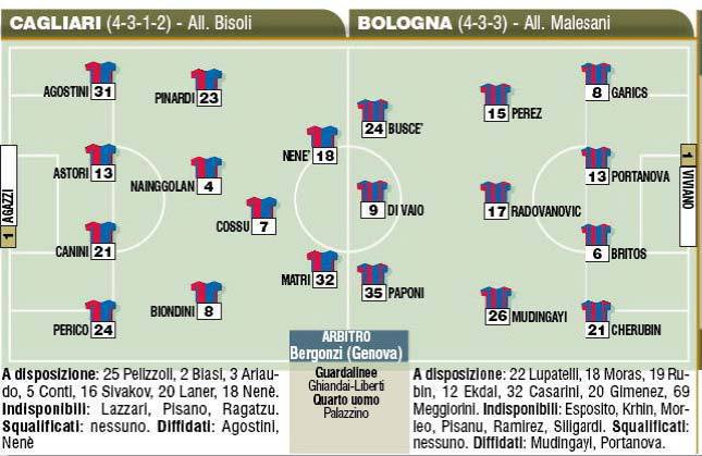 CAGIARI-BOLOGNA – Al Sant’Elia quest’oggi ospite è il Bologna, per gli uomini di Bisoli l’unico obiettivo dev’essere la vittoria, che manca dall’11 settembre. Cagliari in campo con il 4-3-1-2 in attacco inamovibili Matri e Nenè. Bologna che risponde con il 4-3-3 schierato da Malesani con il tridente d’attacco formato da Buscè e Paponi esterni, ed in mezzo l’immancabile Di Vaio. Di seguito le foto con entrambi gli schieramenti.