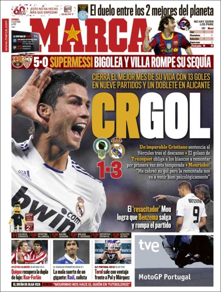 RASSEGNA STAMPA ESTERA MARCA SPAGNA – Dopo tre minuti la partita sembrava incanalarsi su una brutta strada, infatti il gol di Trezeguet per l’Hercules al terzo di gioco ha fatto preoccupare molti tifosi merengues, invece nella ripresa è arrivato prima il pareggio di Di Maria, poi come al suo solito Cristiano Ronaldo ha realizzato una doppietta nell’arco di 4 minuti dall’82esimo all’86 minuto e la partita finisce 1-3 per gli uomini di Mou.
