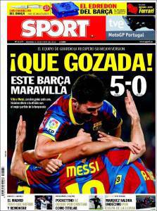 RASSEGNA STAMPA ESTERA SPORT SPAGNA – Come titola il quotidiano iberico Sport, vedere il Barcellona giocare a calcio è veramente una goduria per tutti gli amanti del calcio. Infatti ieri al Camp Nou ennesimo risultato molto tondo, vittoria per 5 a 0 inflitta al Siviglia. I catalani sono stati guidati da una doppietta di Messi, un gol di Dani Alves ed un’altra doppietta stavolta però del bomber spagnolo David Villa.