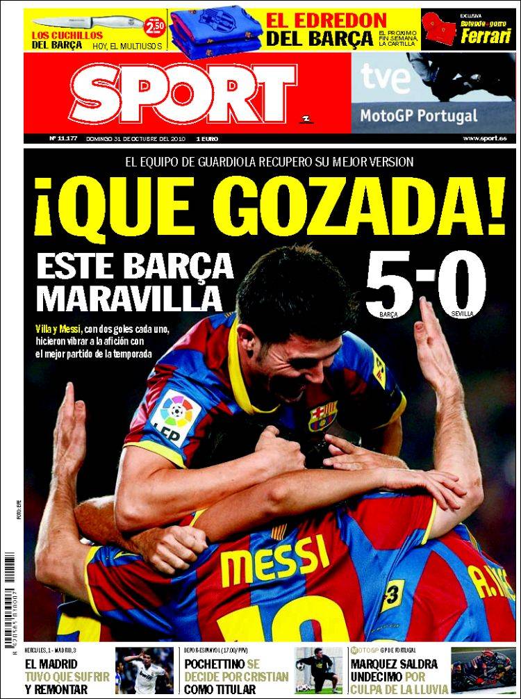 RASSEGNA STAMPA ESTERA SPORT SPAGNA – Come titola il quotidiano iberico Sport, vedere il Barcellona giocare a calcio è veramente una goduria per tutti gli amanti del calcio. Infatti ieri al Camp Nou ennesimo risultato molto tondo, vittoria per 5 a 0 inflitta al Siviglia. I catalani sono stati guidati da una doppietta di Messi, un gol di Dani Alves ed un’altra doppietta stavolta però del bomber spagnolo David Villa.