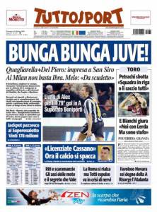 RASSEGNA STAMPA TUTTOSPORT ITALIA – Oggi è successo un fatto molto particolare, infatti se notate bene: sia la Gazzetta dello Sport che Tuttosport hanno lo stesso titolo in prima pagina, vale a dire: “Bunga Bunga Juve”. La prima pagina è riferita chiaramente alla vittoria dei bianconeri ieri sera in casa del Milan per 2 a 1 grazie ai gol di Quagliarella e Del Piero, inutile per i rossoneri il gol di Ibra.