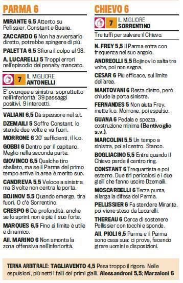 Fantacalcio Serie A Gazzetta Parma Chievo – Pareggio e un punto a testa per Parma e Chievo. Ottima prova, tra gli emiliani, per Antonelli al quale risponde un eccellente voto per il portierone dei veneti, Stefano Sorrentino. Ecco le pagelle della ‘Gazzetta dello Sport’ relative all’incontro tra le due formazioni.