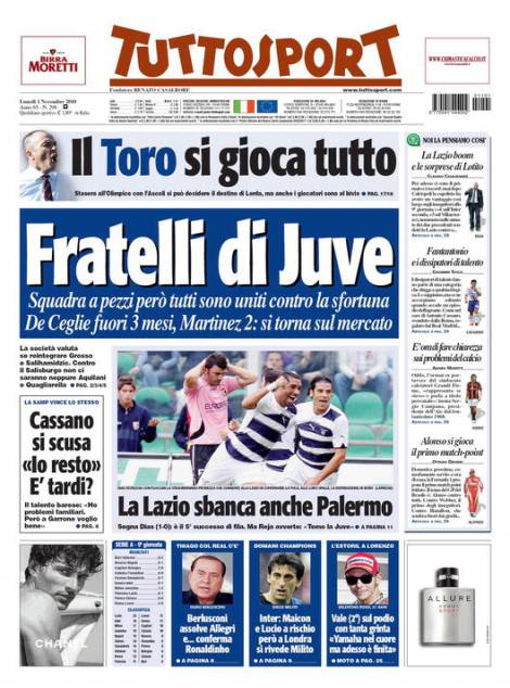 TUTTOSPORT RASSEGNA – Sul quotidiano torinese Tuttosport si parla della Juventus che ha sorpreso tutti vicendo sul campo del Milan per due a uno ma dovrà rinunciare a Martinez e De Ceglie che resteranno fuori per alcuni mesi.
