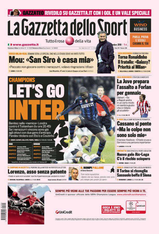 GAZZETTA INTER – Sulla Gazzetta dello Sport si parla del match di questa sera tra Tottenham e Inter nella quarta giornata di Champions League. I nerazzurri di Benitez affronteranno gli inglesi nella loro tana, al White Hart Lane.