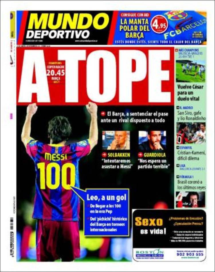 MUNDO DEPORTIVO RASSEGNA – Sul quotidiano catalano Mundo Deportivo si parla del match di questa sera tra Copenhagen e Barcellona per la quarta giornata di Champions League con Lionel Messi che con un gol toccherebbe quota 100 gol segnati nell’era Guardiola.