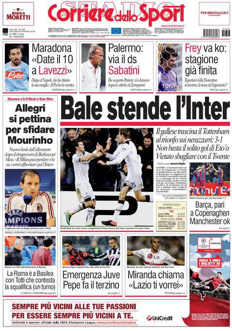 CORRIERE INTER BALE – Anche il Corriere dello Sport parla della sconfitta dell’Inter sul campo del Tottenham per tre a uno con un Bale travolgente autore di due assist e di accellerazioni che hanno annichilito uno spaesato Maicon.