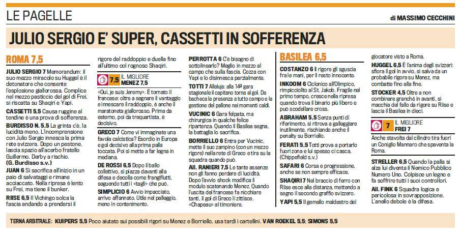 VOTI GAZZETTA BASILEA ROMA – La Roma di Ranieri vince tre a due sul campo del Basilea e ritrova i gol di Totti e Menez. La sorpresa però è il sigillo di Greco, giovane talento giallorosso. Nel finale però quanta sofferenza. Ecco le pagelle della Gazzetta dello Sport.