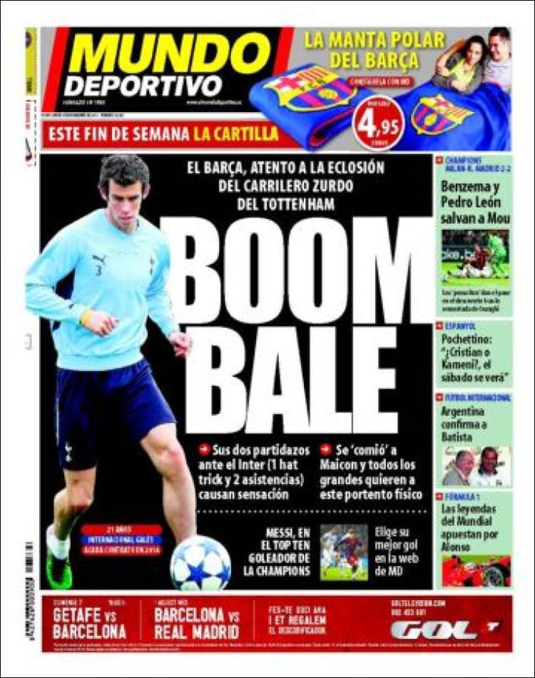 MUNDO DEPORTIVO BALE – Sul quotidiano El Mundo Deportivo si parla del calciomercato Barcellona con i catalani che seguono con attenzione l’esplosione di Gareth Bale, terzino sinistro del Tottenham che piace a mezza Europa.