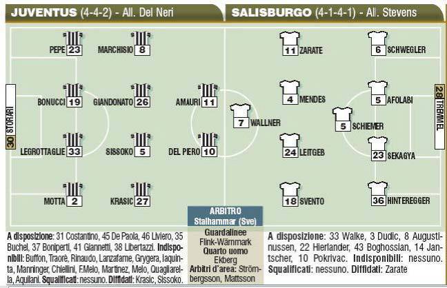 JUVENTUS SALISBURGO EUROPA LEAGUE – Questa sera una Juventus incerottata affronterà in casa il Salisburgo nella quarta giornata di Europa League. Il tecnico Delneri schiererà una formazione inedita con Pepe terzino sinistro e il giovane Giandonato a centrocampo. Ecco le formazioni secondo il Corriere dello Sport.