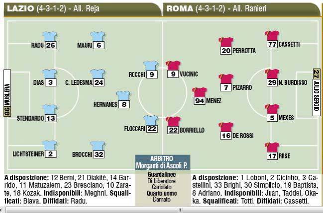 FANTACALCIO SERIE A LAZIO-ROMA – Alle 15:00 allo stadio Olimpico di Roma si gioca il derby della capitale, tra i padroni di casa della Lazio e gli “ospiti” della Roma. Un match importante per entrambe le formazioni, per gli uomini di Reja, che cercano la continuità di risultati positivi, e tentano la fuga in vetta alla classifica, così come per i giallorossi, in cerca del riscatto dopo l’inizio di stagione con il piede sbagliato. Lazio con il 4-3-1-2, inamovibili in avanti Rocchi e Floccari, con il talento Hernanes a supporto. Roma orfana del pupone, con De Rossi in vesti di capitano (al primo derby con la fascia), schiererà anch’essa il 4-3-1-2 con Vucinic, Borriello, e Menez trequartista. Centrocampo muscolare e tecnico con De Rossi, Perrotta e Pizarro. Di seguito le formazioni da parte di entrambi gli schieramenti.
