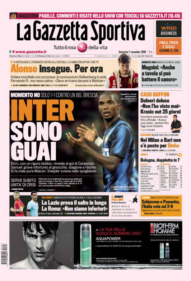 RASSEGNA STAMPA ITALIA GAZZETTA DELLO SPORT – Per l’Inter come riporta la prima pagina della Gazzetta dello Sport sono guai, infatti ieri sera è arrivato un deludente pareggio per 1 a 1 in casa contro il Brescia grazie ad un rigore segnato da Samuel Eto’o. Oltre al danno la beffa, infatti oltre al brutto risultato c’è stato anche l’infortunio di Samuel che rischia la stagione, mentre Maicon ha avuto un fastidio muscolare, brutto episodio per Sneijder che al termine del primo tempo è svenuto negli spoiatoi.
