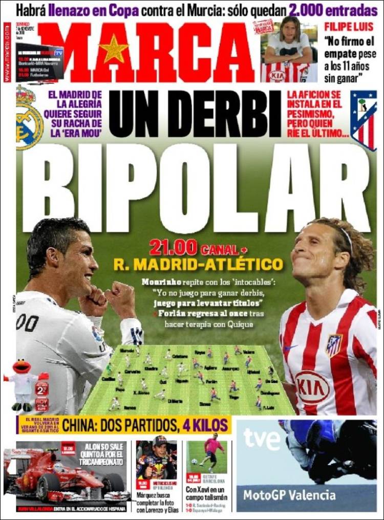 RASSEGNA STAMPA ESTERA MARCA SPAGNA – Stasera come riporta in prima pagina il quotidiano iberico Marca, andrà di scena il derby di Madrid tra Real Madrid e l’Atletico Madrid che si sfideranno allo stadio Santiago Bernabeu alle ore 21,00. Per il tecnico portoghese Josè Mourinho stasera sarà il primo derby spagnolo da allenatore, da non calcolare chiaramente i derby affrontati con l’Espanyol all’epoca in cui era allenatore in seconda di Van Gaal al Barcellona.