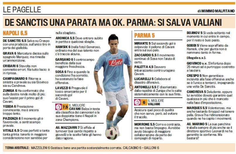 FANTACALCIO SERIE A NAPOLI PARMA PAGELLE – Il Napoli vince due a zero contro il Parma grazie alla doppietta di Edinson Cavani, migliore in campo secondo la Gazzetta dello Sport. Ecco le pagelle del match.
