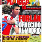 MARCA FORLAN REAL MADRID – Sul quotidiano Marca si parla del futuro di Diego Forlan, bomber dell’Atletico Madrid, che secondo la stampa spagnola è stato offerto al Real Madrid. Il giocatore piace a Mourinho e per il suo trasferimento occorre un investimento da 18 milioni di euro.