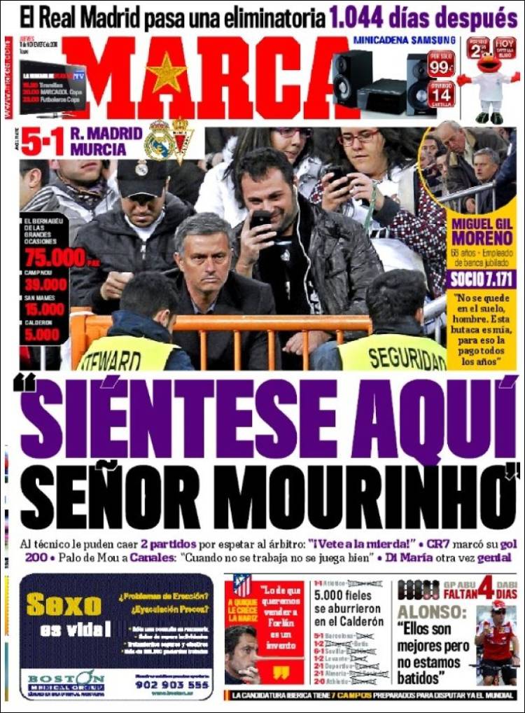 MARCA MOURINHO – Il quotidiano spagnolo Marca parla della prima espulsione rimediata da Josè Mourinho da quando è sulla panchina del Real Madrid. Il cartellino è stato rimediato nella gara di Copa del Rey contro il Murcia, partita vinta dai madrileni per cinque a uno.