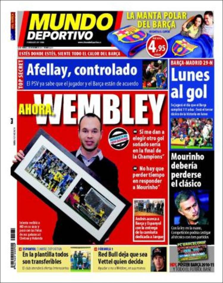 MUNDO DEPORTIVO INIESTA – Sul quotidiano catalano Mundo Deportivo parla Andreas Iniesta, centrocampista del Barcellona che sogna di giocare la finale di Champions League a Wembley nel grande stadio inglese.