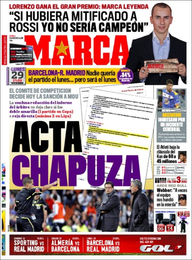 MARCA MOURINHO – Il titolo del quotidiano spagnolo Marca riguarda la squalifica rimediata da Mourinho in Copa del Rey contro il Murcia. Il tecnico portoghese rischia di scontare due giornate di squalifica in campionato qualora la commissione decida di assegnargli il cartellino rosso diretto. In caso di doppio giallo sconterà solo una giornata in Copa del Rey.