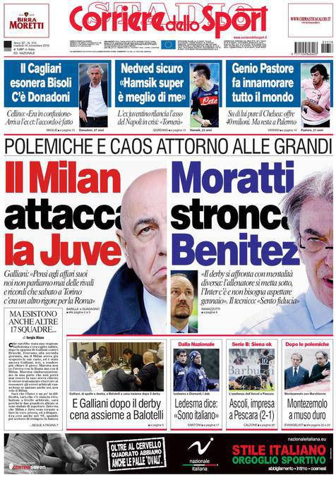 CORRIERE RASSEGNA MORATTI – Anche il Corriere dello Sport parla della crisi dell’Inter con il presidente Massimo Moratti che ha bacchettato il tecnico Benitez dopo la sconfitta nel derby che ha mandato su tutte le furie il patron nerazzurro.
