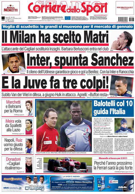 CORRIERE INTER SANCHEZ – Sul Corriere dello Sport si parla del calciomercato delle tre big di Serie A. Il Milan ha scelto Matri per rinforzare l’attacco, la Juventus vuole subito Van der Wiel mentre l’Inter è intenzionata a portare a Milano Sanchez e Inler dall’Udinese, più Ranocchia.