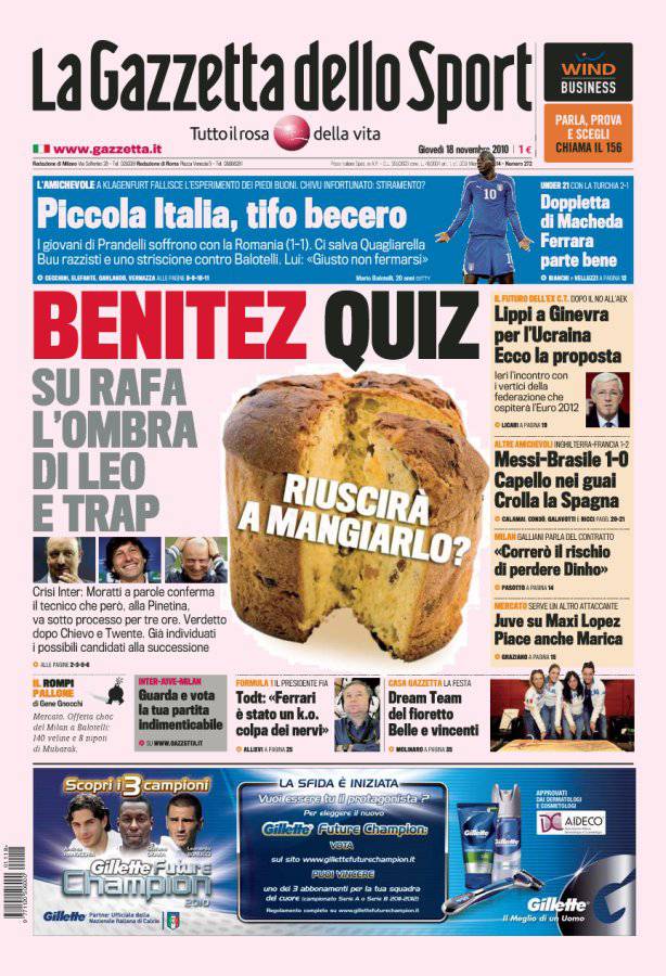 GAZZETTA BENITEZ INTER – Sulla Gazzetta dello Sport si parla della situazione in casa Inter con il tecnico Rafa Benitez in bilico. Il presidente Moratti ieri ha confermato lo spagnolo, ma la candidatura di Leonardo è forte. Si parla anche di un clamoroso ritorno di Trapattoni.