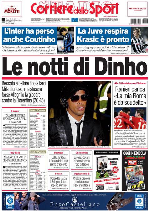 CORRIERE RONALDINHO MILAN – Sul Corriere dello Sport si parla della vita privata di Ronaldinho. Il campione del Milan è stato visto nei locali milanesi fino a tarda notte mandando su tutte le furie la dirigenza rossonera.