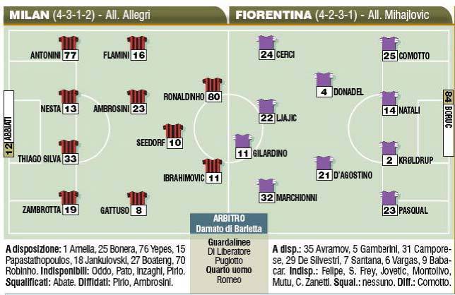 CALCIOMERCATO SERIE A MILAN FIORENTINA FORMAZIONI – Questa sera dopo la partita tra Roma e Udinese, andrà di scena alle ore 20.45 la partita allo stadio San Siro tra il Milan e la Fiorentina, i rossoneri vengono da un ottimo momento soprattutto perchè una settimana fa sono usciti vincitori dal derby contro i cugini interisti, mentre i Viola vivono un periodo molto confusionario tra alti e bassi dove ogni vittoria in questa stagione è arrivata con molta sofferenza e con vittorie di misura sull’avversario. Ecco a voi le probabili formazioni della gara prese dal Corriere dello Sport.