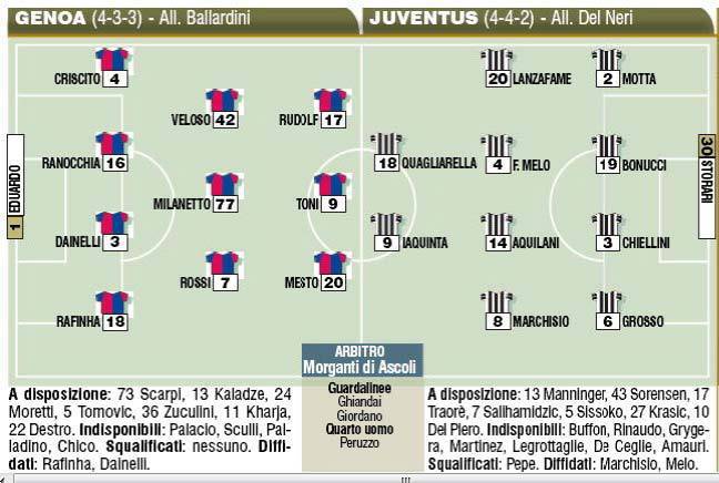 CALCIOMERCATO SERIE A GENOA UDINESE FANTACALCIO FORMAZIONI – Il Corriere dello Sport come ogni giorno in cui c’è una partita di calcio ci fornisce le probabili formazioni. Oggi c’è la Serie A ed alle 12,30 partirà la giornata grazie alla partitia tra Genoa e la Juventus in cerca di vittoria su un campo difficile come quello di Marassi dove i rossoblù sono in cerca di riscatto dopo il brutto periodo che stanno attraversando in questo momento. Mentre i bianconeri devono vincere assolutamente per non allontanarsi dalla vetta e da tutto il blocco delle prime posizioni, anche perchè ieri sia Milan che Roma hanno allungato sui bianconeri oltre che sull’Inter che giocherà dopo.