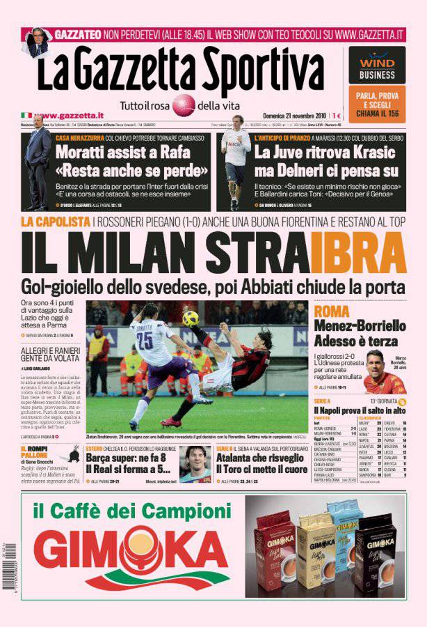 CALCIOMERCATO GAZZETTA DELLO SPORT RASSEGNA – Il Milan vola con Zlatan Ibrahimovic da solo in vetta a +4 dalla seconda, la Lazio. Ieri infatti i rossoneri nell’anticipo del sabato delle 20.45 hanno battuto anche una buona Fiorentina che ha cercato di impegnare il Milan ma la squadra da quando c’è Zlatan Ibrahimovic sta perdendo pochi punti. Per lo svedese sono già arrivati 10 gol in 15 partite con il club di via Turati, una media gol ottima per lo svedese che è stato anche un uomo-campionato per tre anni di fila quando vestiva la maglia dell’Inter.