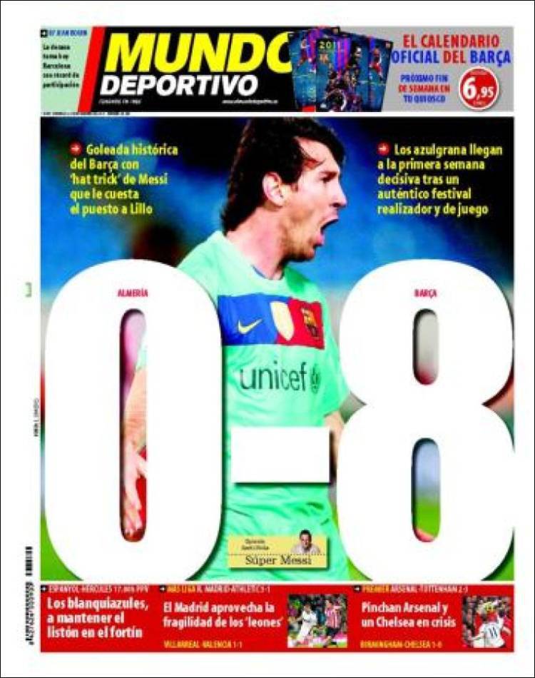 CALCIOMERCATO MUNDO DEPORTIVO RASSEGNA STAMPA ESTERA SPAGNA – Che partita ieri del Barcelona, una vera e propria macchina da gol incontenibile che ha tritato, calcisticamente parlando l’Almeria fuori casa. Il Barça ha vinto per 0-8 grazie alla tripletta del solito Lionel Messi, al gol di Pedro e di Iniesta, ad un autogol di Acasiete e della doppietta del giovane Bojan Krkic subentrato dalla panchina ma con tanta voglia di far bene tanto da fare due gol in nove minuti di gioco circa.