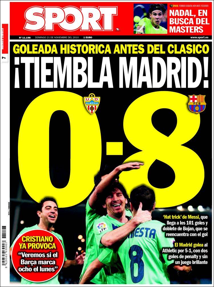 CALCIOMERCATO SPORT RASSEGNA STAMPA ESTERA SPAGNA – Ieri sera ci sono state due partite molto importanti e molto belle in Spagna che sono state giocate dal Barcellona e dal Real Madrid. Il titolo della prima pagina di Sport “Trema Madrid” si riferisce al risultato raggiunto ieri sera dal Barcellona, che ha vinto per 8 a 0 contro l’Almeria e che nella prossima gara ci sarà il Super Classico tra Barcellona e Real Madrid, proprio quest’ultimi hanno però vinto con una goleada; 5-1 inflitto all’Atletich Bilbao al Santiago Bernabeu grazie ai gol di Gonzalo Higuain, Sergio Ramos e tripletta del solito Cristiano Ronaldo.
