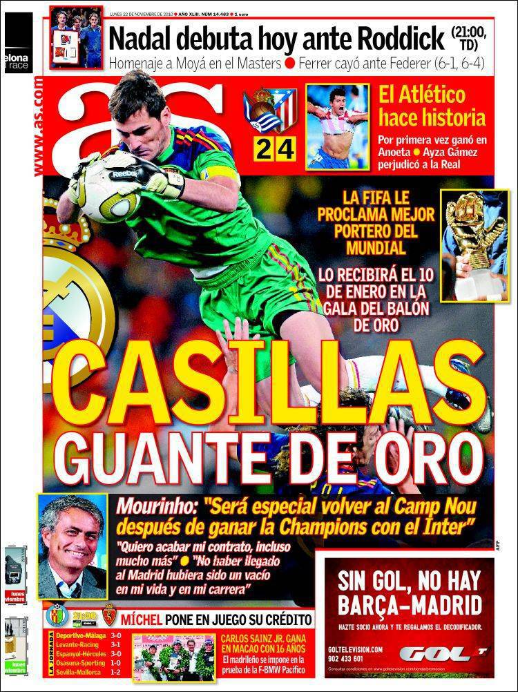 AS CASILLAS MONDIALE – Il portiere spagnolo Iker Casillas, attuale numero uno della Spagna e del Real Madrid, è stato nominato dalla Fifa come il miglior portiere del Mondiale. Intanto Mourinho ha dichiarato di essere già emozionato nel tornare al Cam Nou dopo l’avventura con l’Inter della passata stagione.