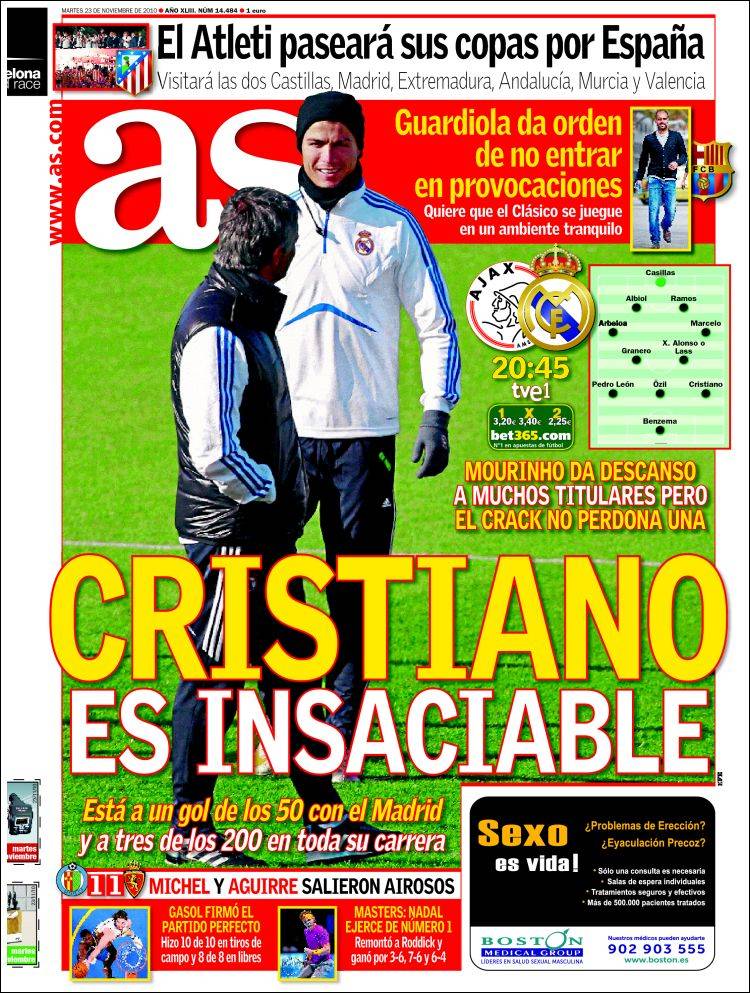 AS RONALDO REAL MADRID – Il quotidiano spagnolo As parla di Cristiano Ronaldo, stella del Real Madrid, a cui manca un gol per toccare quota 50 reti con la maglia delle “merengues”. Non solo, al portoghese mancano tre gol per arrivare a quota 200 reti in carriera.