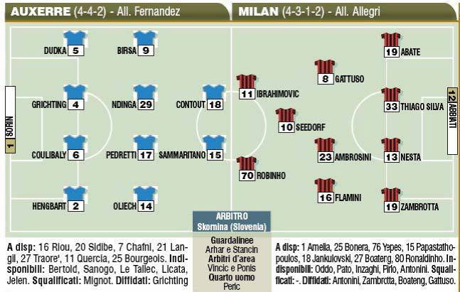 CHAMPIONS LEAGUE AUXERRE MILAN PROBABILI FORMAZIONI – Questa sera il Milan di Allegri sfiderà l’Auxerre nella quinta giornata dei gironi di Champions League. Un match che i rossoneri dovranno necessariamente vincere. Allegri punta su Ibrahimovic, con Robinho e Seedorf a completare l’attacco. Ecco le formazioni del Corriere dello Sport.