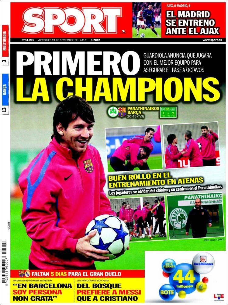 SPORT BARCELLONA CHAMPIONS – Sul quotidiano catalano Sport si parla dell’impegno di questa sera del Barcellona sul campo del Panathinaikos. Il tecnico Guardiola non vuole pensare al match di lunedì contro il Real Madrid e chiede la massima concentrazione a Messi e soci.