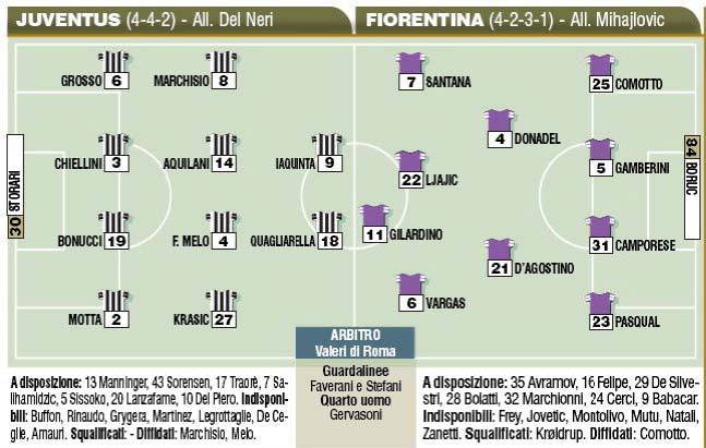 FANTACALCIO JUVENTUS FIORENTINA SERIE A – Questa grande match allo stadio Olimpico di Torino tra Juventus e Fiorentina. Nei bianconeri il tecnico Delneri punta sulla coppia d’attacco Quagliarella-Iaquinta con Del Piero in panchina. La Fiorentina chiede a Gilardino il gol da tre punti. Le formazioni secondo il Corriere dello Sport.