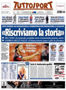 RASSEGNA STAMPA TUTTOSPORT – L’allenatore della Juventus Gigi Del Neri ha parlato ieri in conferenza stampa nella solita intervista prepartita del giorno prima della gara, infatti oggi la sua Juve affronterà allo stadio Olimpico di Torino la Fiorentina ed il tecnico bianconero ha voluto caricare i suoi giocatori dichiarando: “Dobbiamo riscrivere la storia”, il tecnico vuole avvicinarsi il più possibile alla vetta per poter lottare per lo scudetto fino all’ultime giornate.