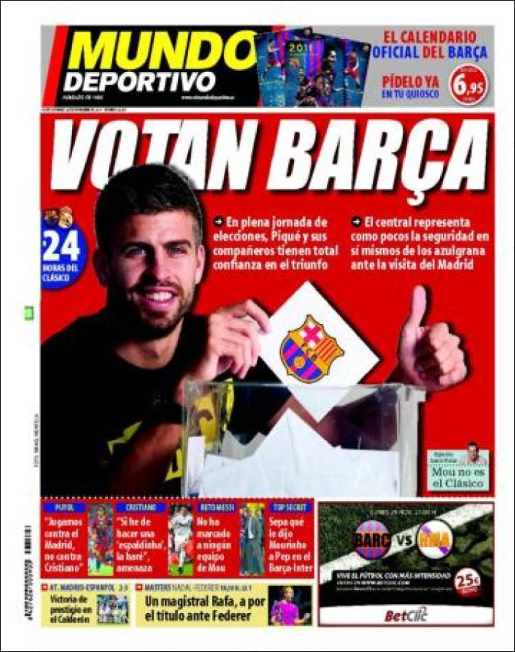 EL MUNDO DEPORTIVO REAL MADRID BARCELLONA RASSEGNA STAMPA ESTERA SPAGNA – Il difensore del Barcellona, Piquè, in piena campagna elettorale, “vota” Barcellona in vista del posticipo della Liga in programma domani sera al Camp Nou, la magica sfida fra i campioni di Spagna e il Real Madrid, il clasico spagnolo.