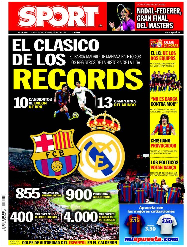 RASSEGNA STAMPA SPAGNOLA ESTERO SPORT – Anche il quotidiano catalano Sport si sofferma sulla partitissima del Camp Nou fra il Barcellona e il Real Madrid, in programma domani sera in Catalogna. Sport si sofferma in particolare sui numeri impressionati “in campo” durante il match di lunedì.