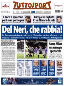 CALCIOMERCATO TUTTOSPORT RASSEGNA STAMPA – Molta rabbia per il tecnico bianconero Gigi Del Neri che ieri sera è stato bloccato sul risultato di 1 a 1 in casa allo Stadio Olimpico di Torino contro la Fiorentina che era andata persino in vantaggio con un autogol di Motta dopo 5 minuti di gioco, il pareggio per i bianconeri è arrivato alla fine della gara, al ’38esimo minuto circa e la Juve rimane sempre a -6 dalla capolita Milan che anch’essa ha pareggiato per 1 a 1 ieri.