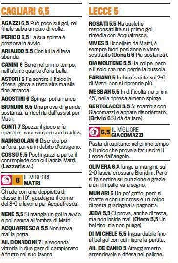 Fantacalcio Serie A voti pagelle Gazzetta Cagliari Lecce – E’ Alessandro Matri, il grande protagonista della vittoria per 3 a 2 del suo Cagliari sul Lecce e dei rumors di calciomercato che lo vedono molto vicino al Milan di Massimiliano Allegri. In attesa di sapere quale sarà il suo destino, gustiamoci le pagelle della ‘Gazzetta dello Sport’ relative al match tra sardi e salentini.