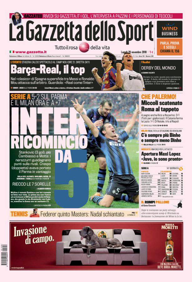 GAZZETTA RASSEGNA INTER – Sulla Gazzetta dello Sport si parla della vittoria dell’Inter in campionato contro il Parma per cinque a due con tripletta di un sontuoso Stankovic. Turno di campionato favorevole ai nerazzurri che hanno rosicchiato punti alle dirette avversarie.