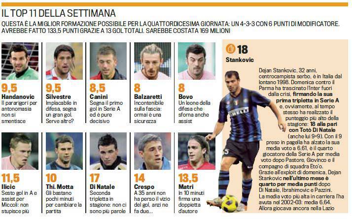 Fantacalcio Serie A Top 11 quattordicesima giornata Gazzetta – Nel puntuale appuntamento del martedì, la ‘Gazzetta dello Sport’ ci propone la sua personale ‘Top 11’ dei migliori giocatori della quattordicesima giornata di Serie A. Spiccano, naturalmente, le triplette di Dejan Stankovic e Totò Di Natale.