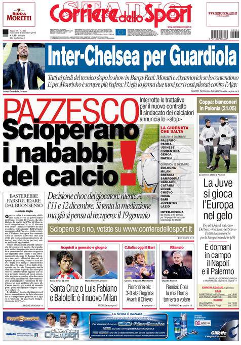 CORRIERE SCIOPERO RASSEGNA – Il Corriere dello Sport è incredulo per lo sciopero dei calciatori confermato per la prossima giornata di campionato che si svolgerà l’11 e il 12 dicembre. Molti tifosi in protesta, si pensa già a una data per recuperare la giornata.
