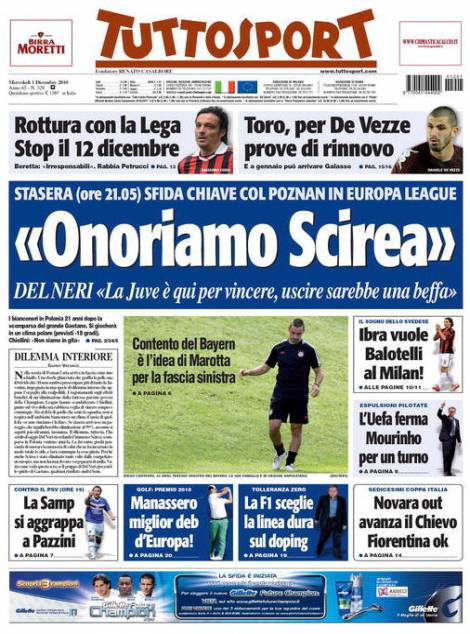 TUTTOSPORT JUVENTUS RASSEGNA – Sul quotidiano torinese Tuttosport si parla della sfida di Europa League tra Lech Poznan e Juventus con i bianconeri che dovranno vincere per non essere eliminati. Ieri in conferenza stampa il tecnico Delneri ha promesso ai tifosi tanto impegno per onorare la memoria di Gaetano Scirea.