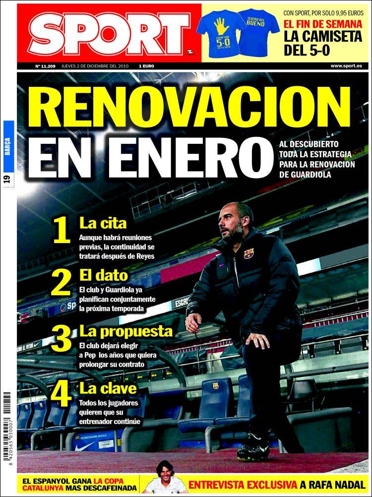 SPORT BARCELLONA GUARDIOLA – L’altro quotidiano catalano Sport parla del rinnovo di Pep Guardiola, tecnico del Barcellona, protagonista in questi giorni dopo il cinque a zero rifilato al Real Madrid di Mourinho. Il rinnovo del contratto che scadrà nel 2012 dovrebbe essere prolungato nel mese di gennaio.