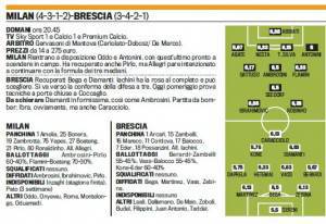 SERIE A MILAN-BRESCIA- Il Milan, dopo il pareggio con la Samp, cerca una nuova vittoria nell’anticipo di sabato alle 20,45 contro il Brescia. Caracciolo e compagni, invece cercano un’altra impresa a San Siro dopo il pareggio contro l’Inter. Rossoneri in campo con Abbiati in porta; Abate, Nesta, Thiago Silva, Antoni, che ritorna dopo l’infortunio; a centrocampo Gattuso, Flamini, che dovrebbe vincere il ballottaggio con Boateng, e Ambrosini, che dovrebbe essere preferito a Pirlo; in avanti Seedorf dietro a Ibrahimovic e Robinho. Gli ospiti scenderanno in campo con Sereni in porta; Zebina; Bega e Martinez in difesa; Benardi, Vass, per andesso in vantaggio su Baiocco, Atemaj e Drapela; trequartisti Diamanti e Kone, preferito ad Eder; unica punta Caracciolo. Stotto l’ìmmagine delle formazioni, con relativi ballottaggi, diffidati e indisponibili.